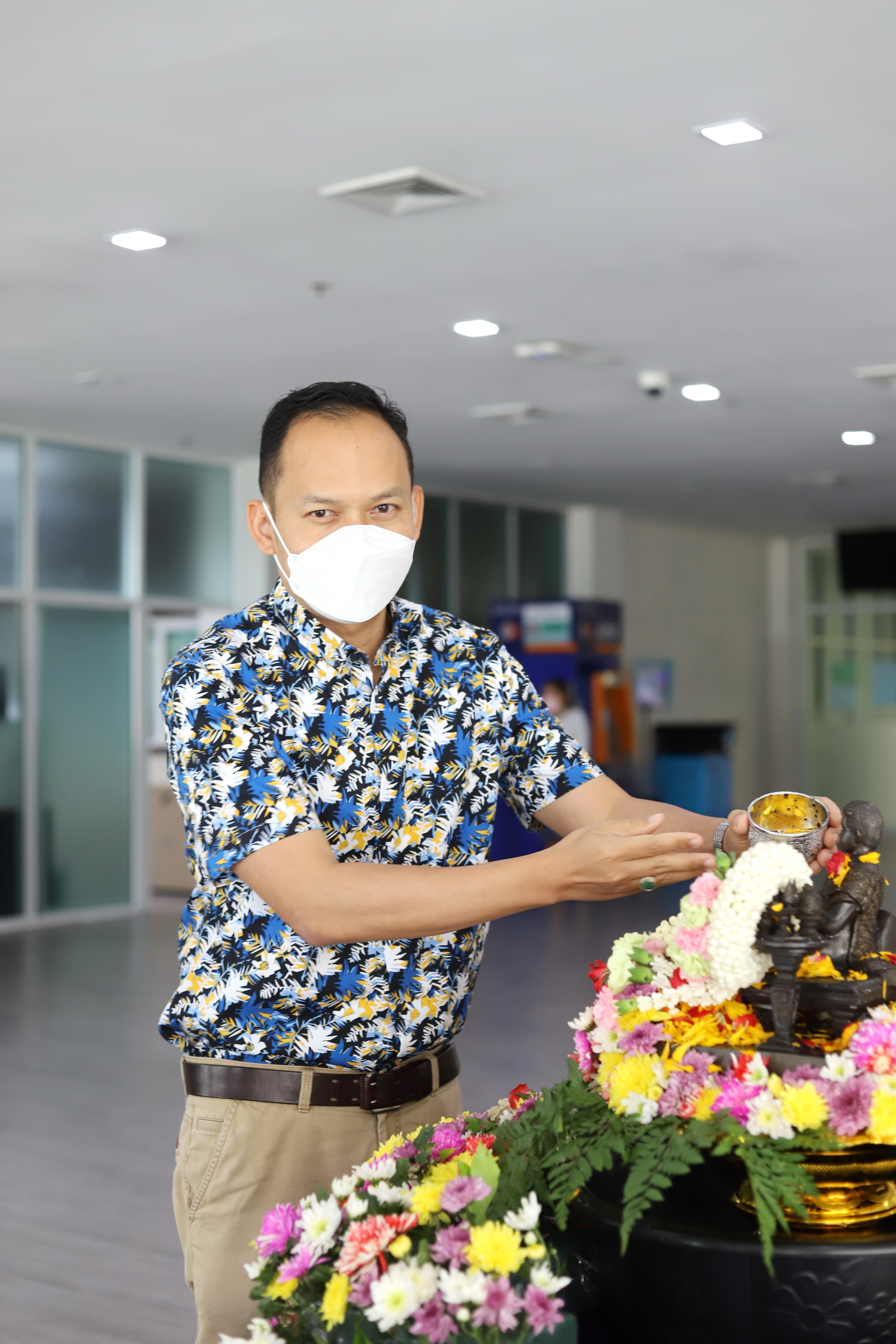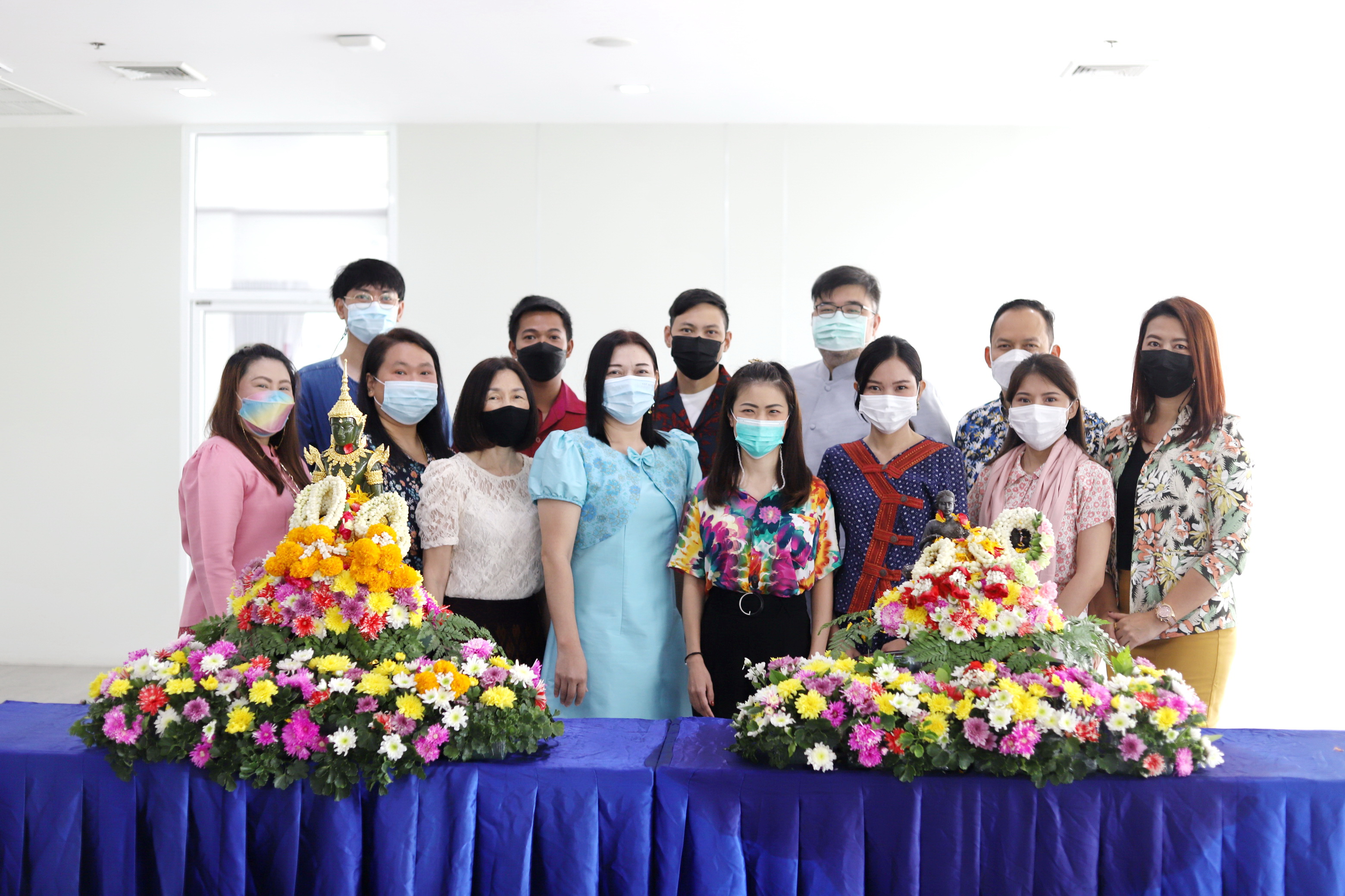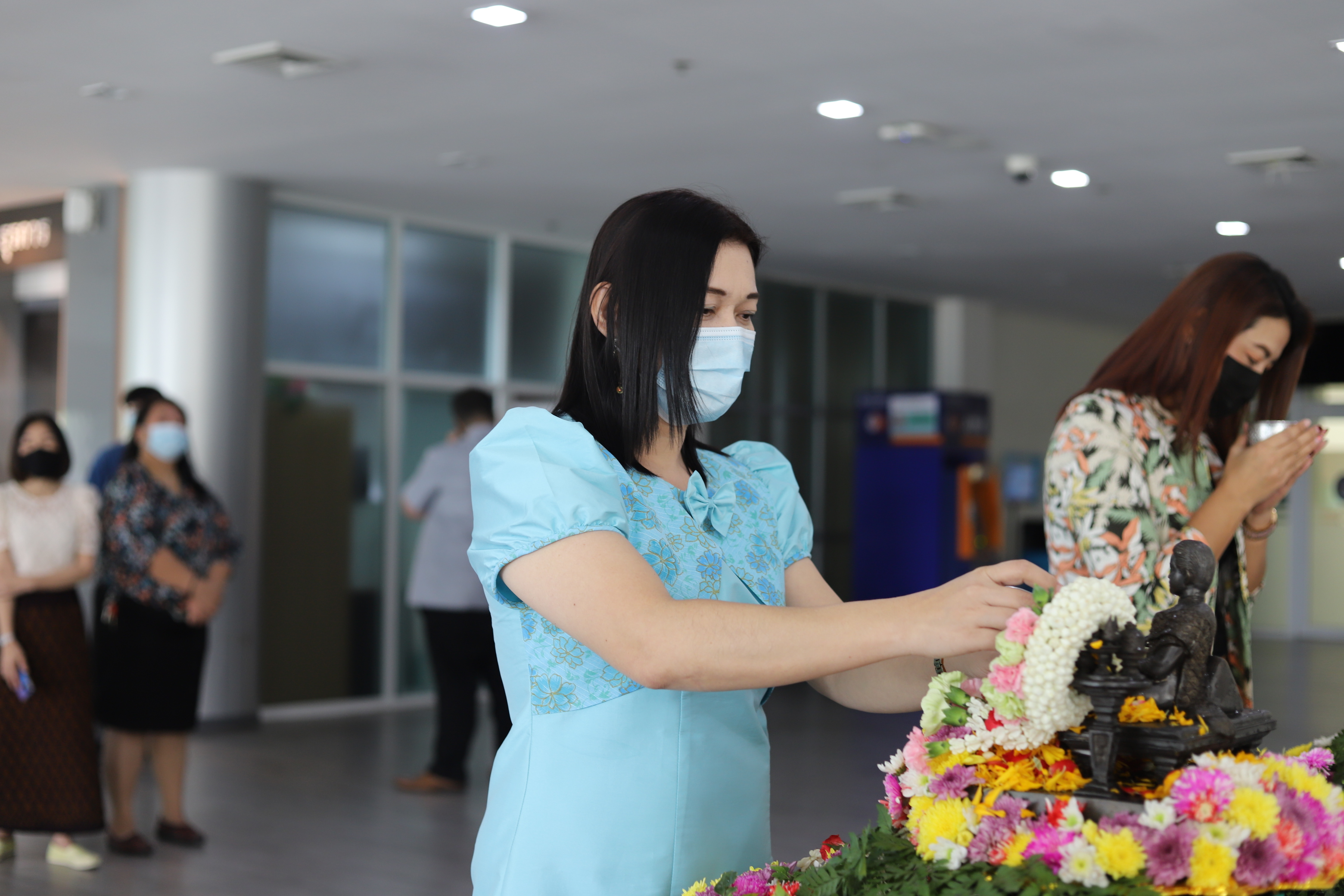 Buddha bathing atmosphere and pay homage to the image of Her Majesty Queen Sunandha Kumariratana Phra Borommaratchathewi To continue the Songkran tradition of the year 2022 led by Dr. Chatrat Hotawaisaya, Dean of the College of Logistics and Supply Chain. with executives and faculty members at the Nakhon Pathom campus office Suan Sunandha Rajabhat University