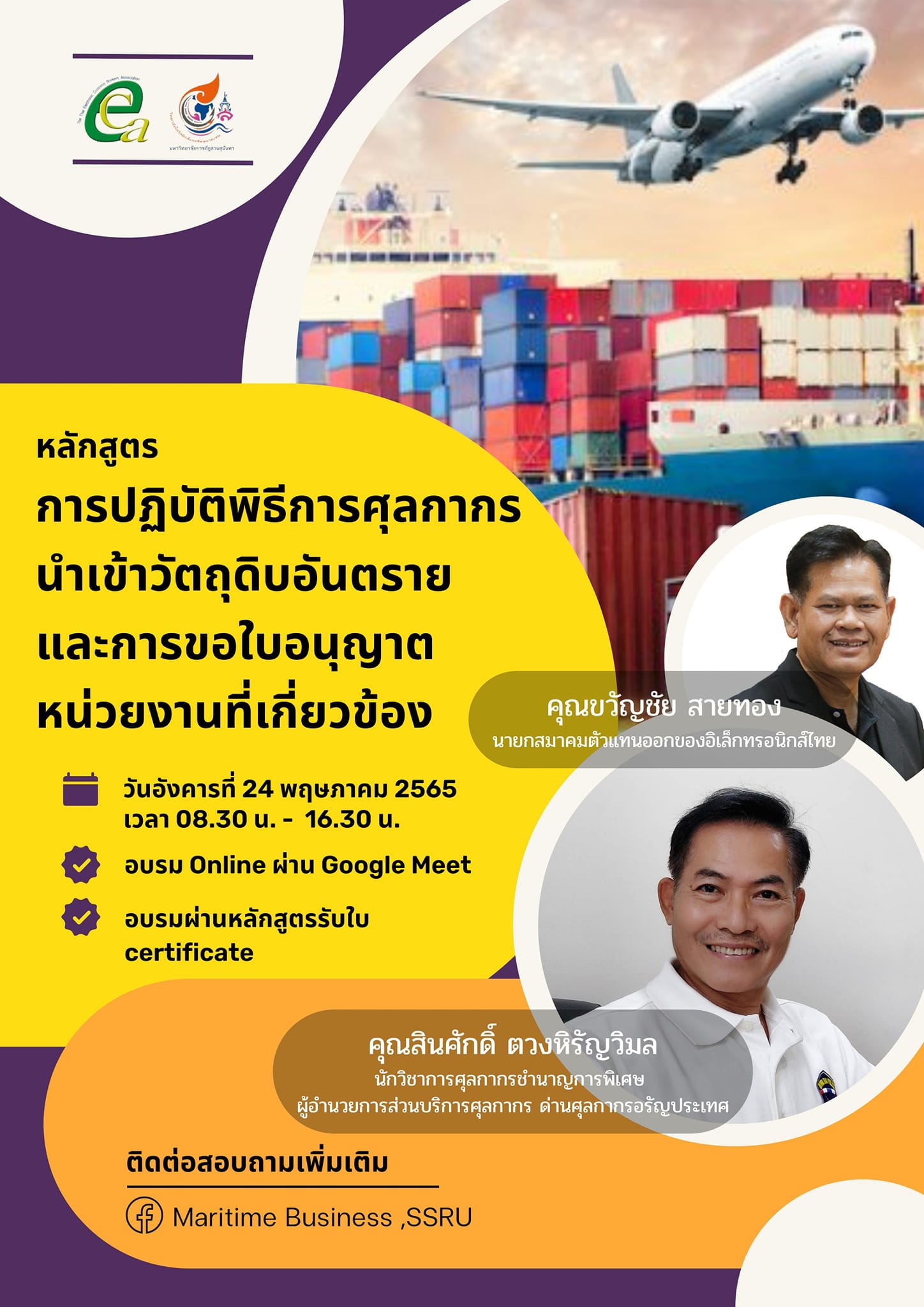 May 24, 2022 College of Logistics and Supply Chain by the Naval Business Organize training on customs procedures for importing dangerous raw materials and obtaining permits from relevant agencies honored by President of the Thai Electronic Exporters Association and Specialized Customs Scholar Director of Customs Service Aranyaprathet customs house Lecturer for this lecture in the form of online training via Google Meet