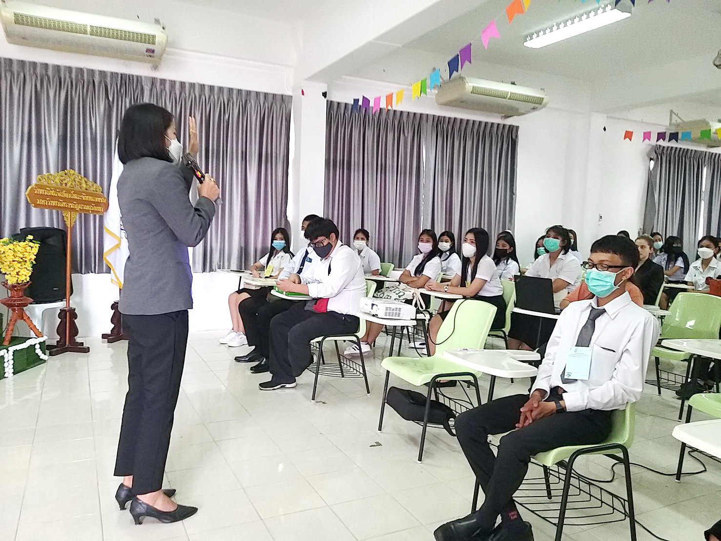 Welcoming new students, led by Deputy Dean for Planning and Quality Assurance, Dr. Sudarat Phimonrattanakan Deputy Dean for Special Affairs, Ajarn Dr. Suphamit Srisawad, along with a team of teachers in the new student orientation activity Logistics Management Education Center, Chonburi Province