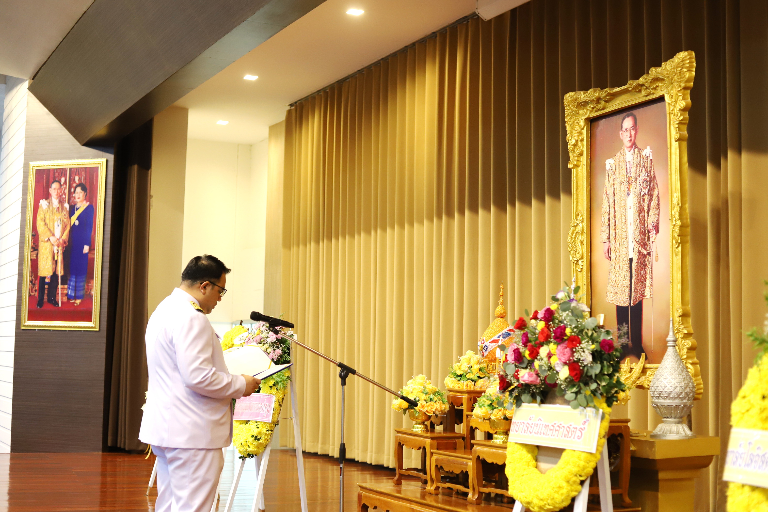 Dean of the College assigns Deputy Dean for Student Affairs representing the laying of wreaths in the memorial service of His Majesty the King on the occasion of his death His Majesty King Bhumibol Adulyadej Maha Bhumibol Adulyadej the Great, by the management, faculty and students of the College of Logistics and Supply Chain join in offering alms to monks and stood still and remembrance of His Majesty together