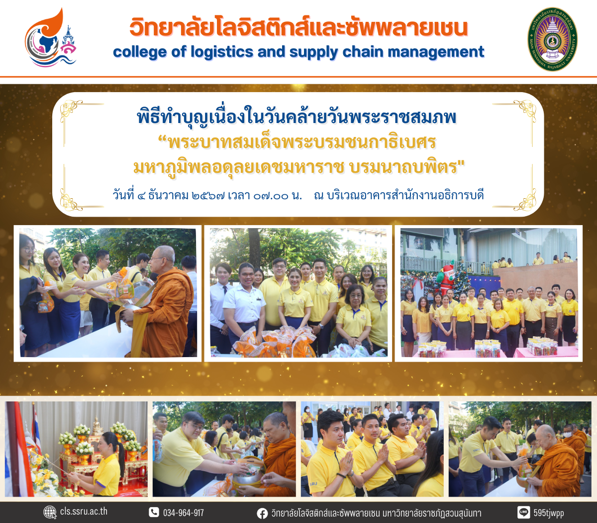 The College of Logistics and Supply Chain, led by Assistant Professor Dr.Assistant Professor Dr. Chanicha Moryadee, Dean of the College of Logistics and Supply Chain, along with executives, faculty members, and staff, participated in a merit-making ceremony on the occasion of the birthday anniversary of His Majesty King Bhumibol Adulyadej the Great, organized by the Student Development Division of Suan Sunandha Rajabhat University.