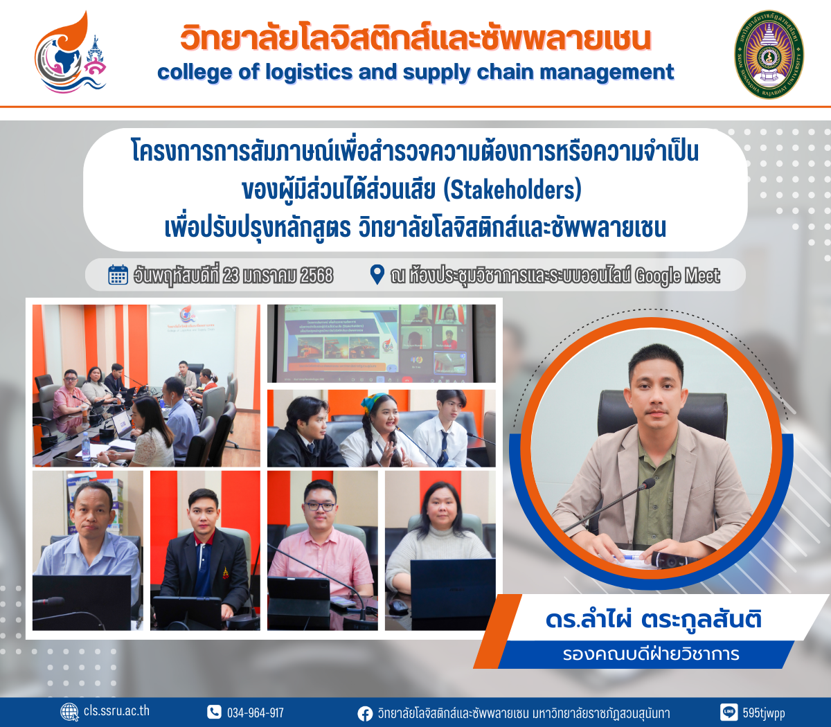 College of Logistics and Supply Chain "Organized an interview project to explore the needs or needs of stakeholders (Stakeholders) to improve the curriculum of the College of Logistics and Supply Chain", chaired by Dr. Lampai Trakulsanti, Deputy Dean for Academic Affairs, along with the committee, faculty members, staff and student representatives attending the meeting