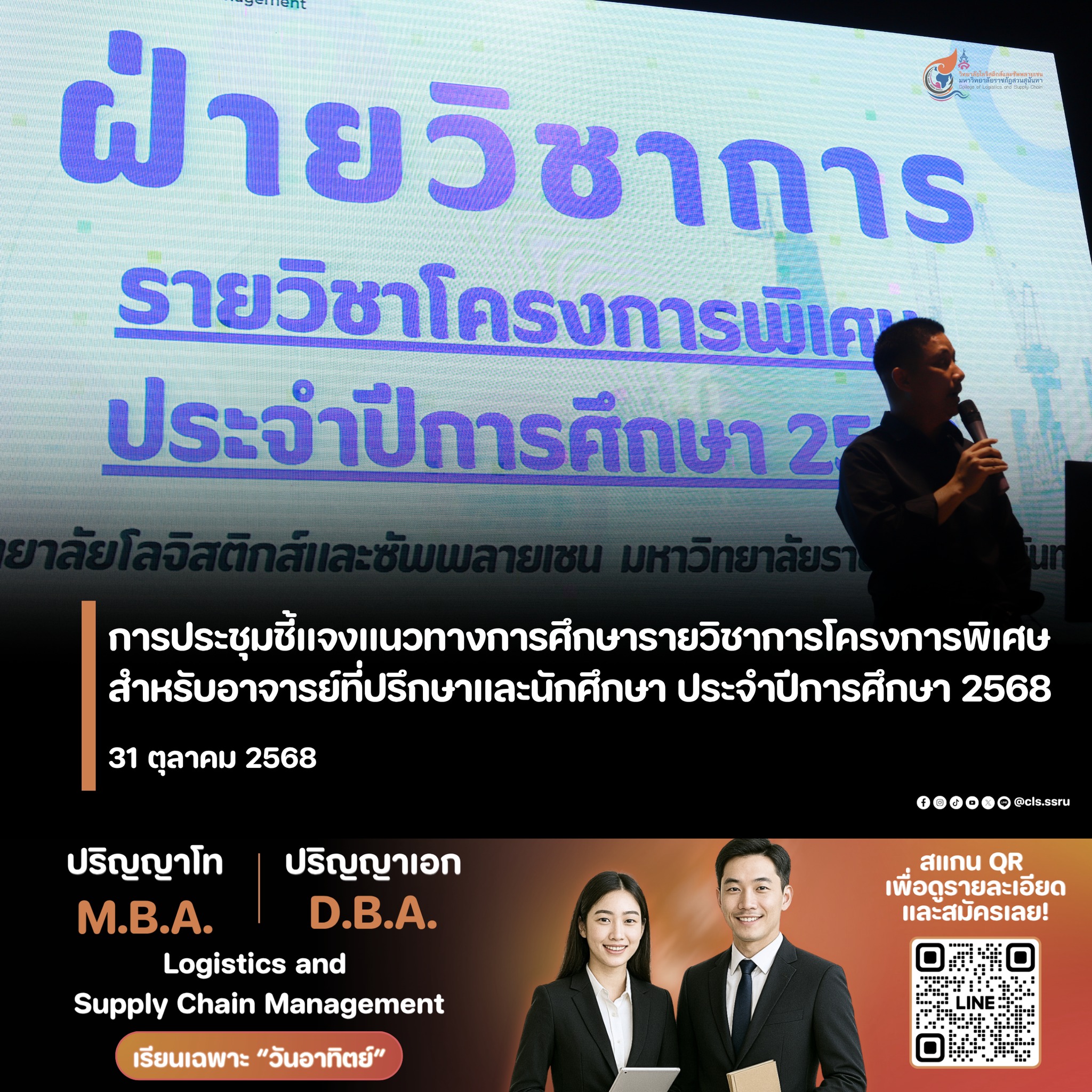 On Friday, October 31, 2025, the College of Logistics and Supply Chain, Suan Sunandha Rajabhat University, through the Academic Affairs Division, organized a meeting to explain the study guidelines for special project courses for advisors and students for the 2025 academic year, including the selection of special project advisors for the second semester of 2025 for students with student ID number 66 of the College.