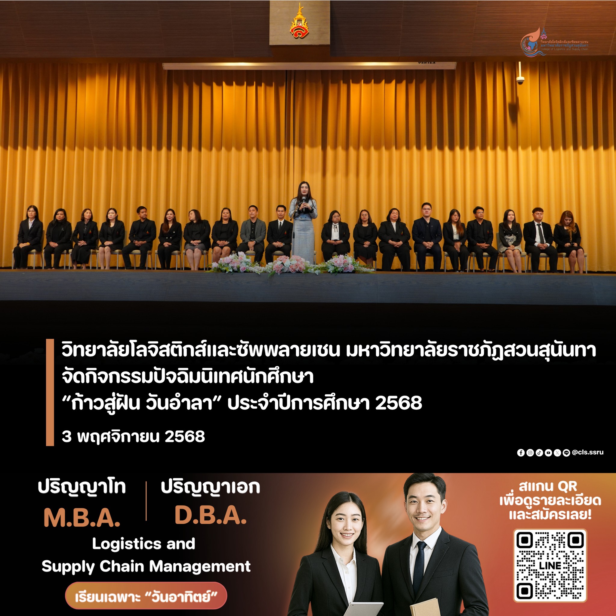 On November 3, 2025, the College of Logistics and Supply Chain, Suan Sunandha Rajabhat University, Nakhon Pathom Campus, organized a Farewell Ceremony for New Students, "Step to the Dream, Farewell Day," for the 2025 Academic Year. This ceremony aimed to prepare and inspire students for their future careers and further education.