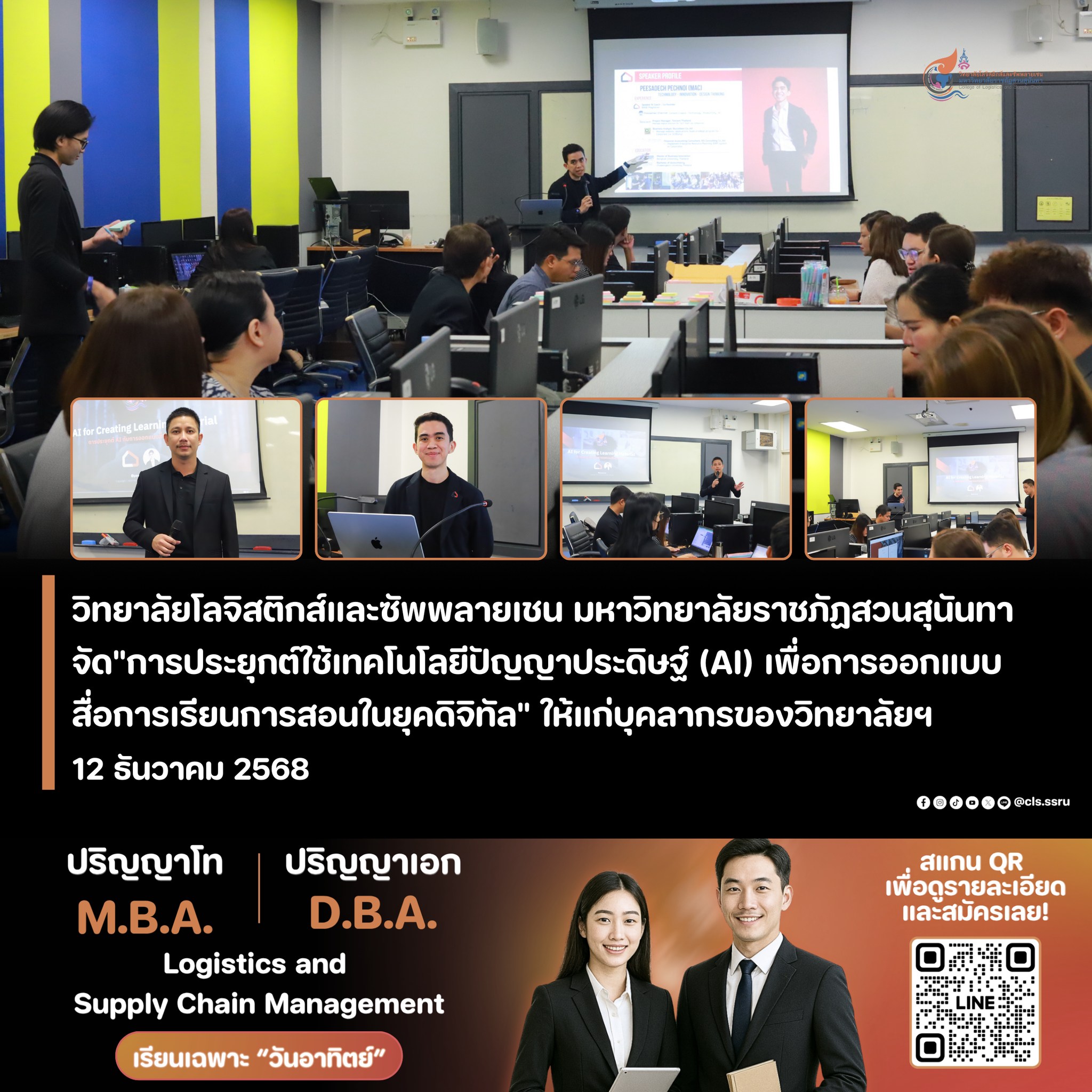 The College of Logistics and Supply Chain, Suan Sunandha Rajabhat University, through its Academic Affairs Division, organized a workshop on "Applying Artificial Intelligence (AI) Technology for Designing Instructional Media in the Digital Age" for the college's personnel. This aimed to enhance and develop the potential for producing more modern and effective instructional media.
