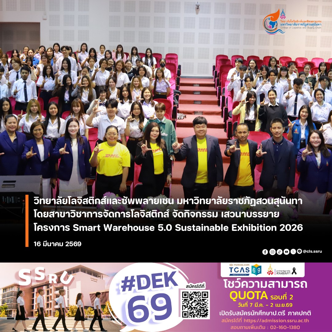 The College of Logistics and Supply Chain, Suan Sunandha Rajabhat University, through the Logistics Management program, organized a seminar and presentation on the Smart Warehouse 5.0 Sustainable Exhibition 2026 project to provide perspectives on smart warehouse technology and modern logistics innovations.