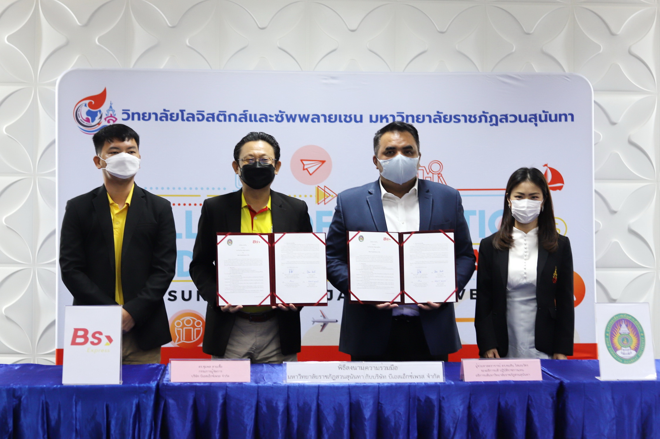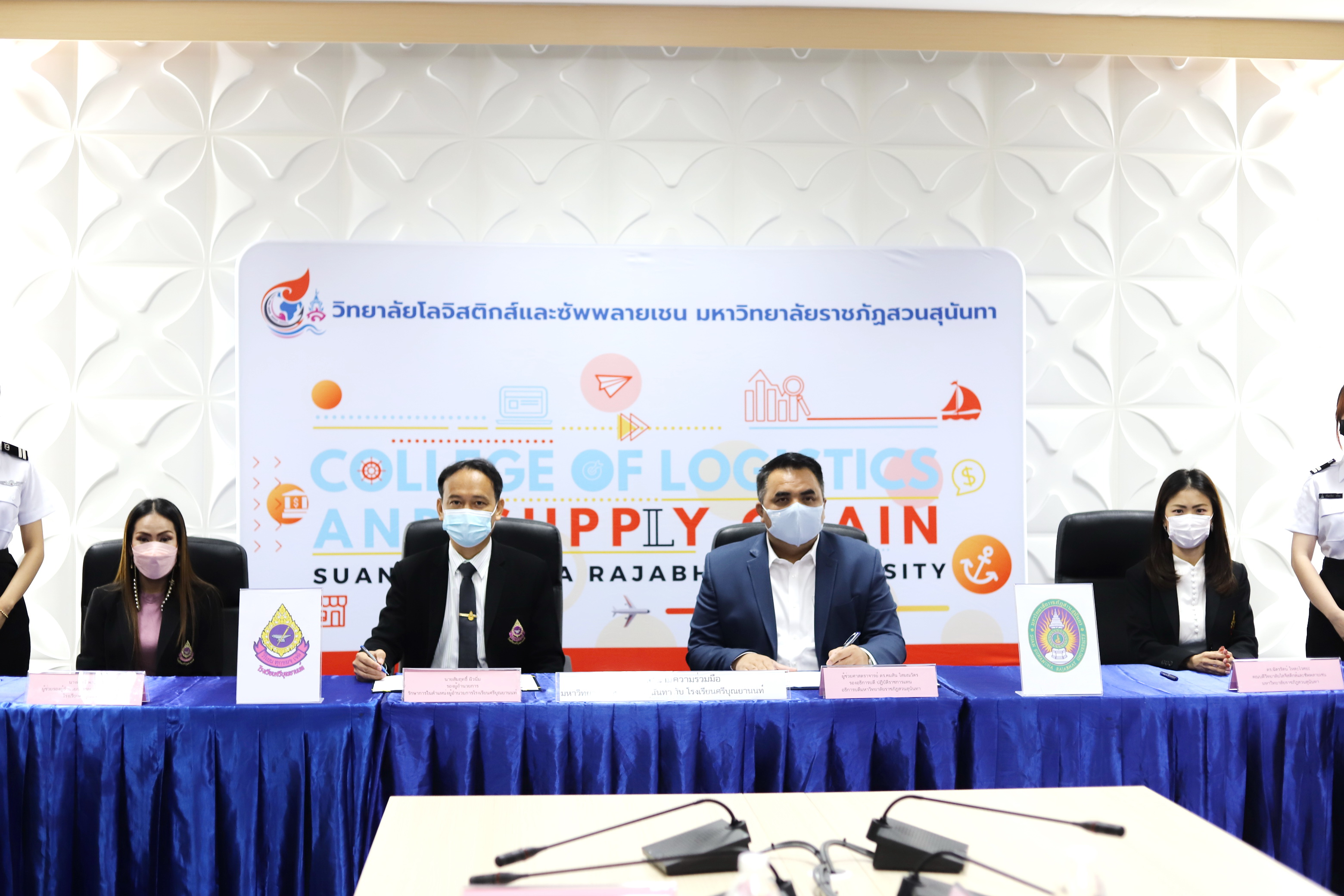 April 5, 2022 College of Logistics and Supply Chain Suan Sunandha Rajabhat University led by Vice President for Nakhon Pathom Campus and Dean of the College of Logistics and Supply Chain. Signed a cooperation agreement with Sribunyanon School and BS Express Co., Ltd. to jointly formulate a policy to develop a modern education system with the Higher Education Sandbox mechanism aiming to increase the potential of the personnel of the establishment. Develop professional skills in accordance with the demands of the labor market. Under the cooperation of educational institutions and the private sector at Kaew Chao Chom Conference Room, 4th Floor, College of Communication Arts