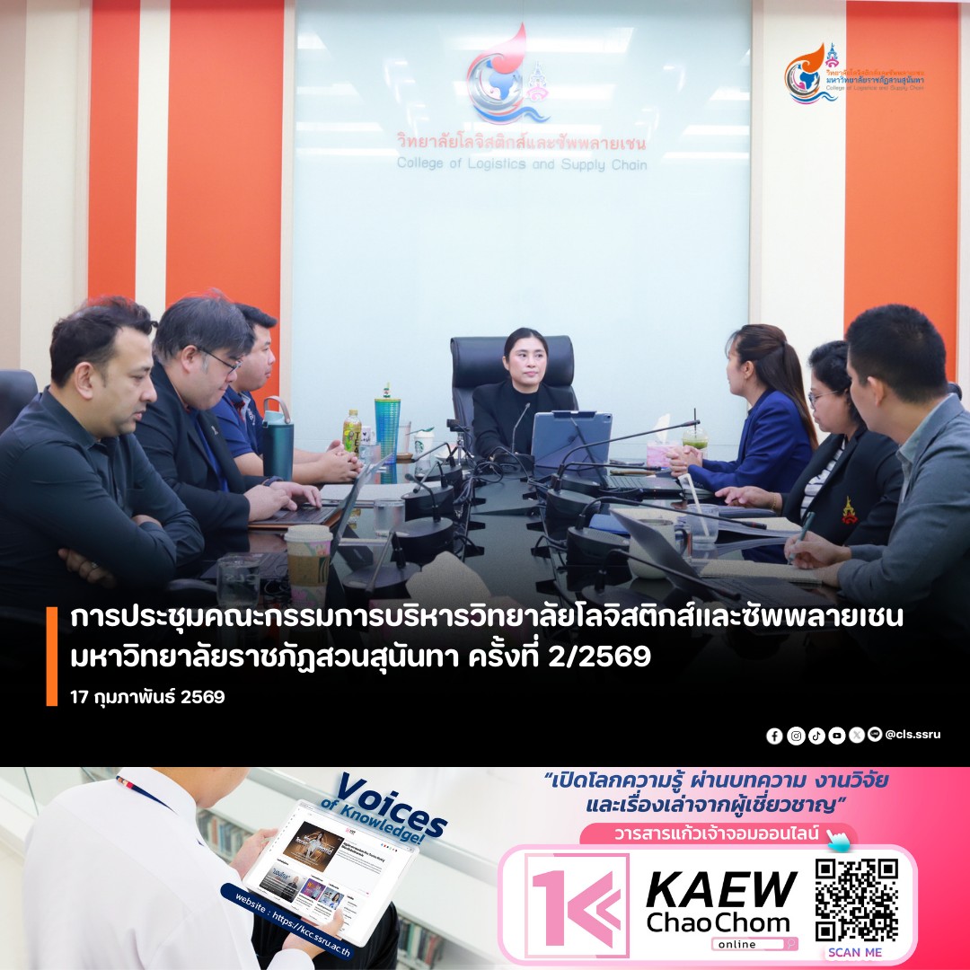 The College of Logistics and Supply Chain, Suan Sunandha Rajabhat University, held its 2nd/2026 meeting of the College of Logistics and Supply Chain Management Executive Committee. Assistant Professor Dr. Chanicha Moyadee, Dean of the College, chaired the meeting, which was attended by the executive committee and relevant staff.