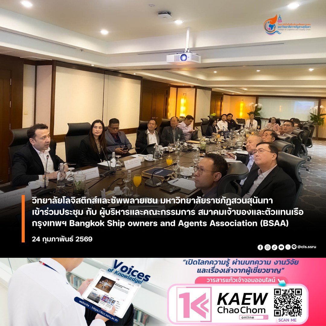 Assistant Professor Dr. Chanicha Moyadee, Dean of the College of Logistics and Supply Chain, and Assistant Professor Dr. Mano Prachyaphipat, Associate Dean for Business and Revenue Development, participated in a meeting with executives and board members of the Bangkok Ship Owners and Agents Association (BSAA). The discussions focused on academic collaboration and human resource development in maritime commerce, maritime logistics and supply chain, developing essential skills for businesses involved in maritime transport, knowledge exchange, and practical work experience. Maritime transport plays a crucial role in Thailand's economic and industrial development. The meeting also aimed to promote cooperation among relevant agencies in the maritime transport chain to concretely support and address the industry's needs now and in the future.