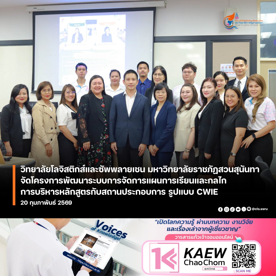 วิทยาลัยโลจิสติกส์และซัพพลายเชน มหาวิทยาลัยราชภัฏสวนสุนันทา โดยฝ่ายวิชาการ จัดโครงการสัมมนาเชิงปฏิบัติการ “การพัฒนาระบบการจัดการแผนการเรียนและกลไกการบริหารหลักสูตรกับสถานประกอบการ CWIE” เพื่อเสริมสร้างศักยภาพบุคลากรสายวิชาการ และสร้างมาตรฐานใหม่ในการจัดการศึกษาที่ตอบโจทย์ภาคอุตสาหกรรมอย่างยั่งยืน