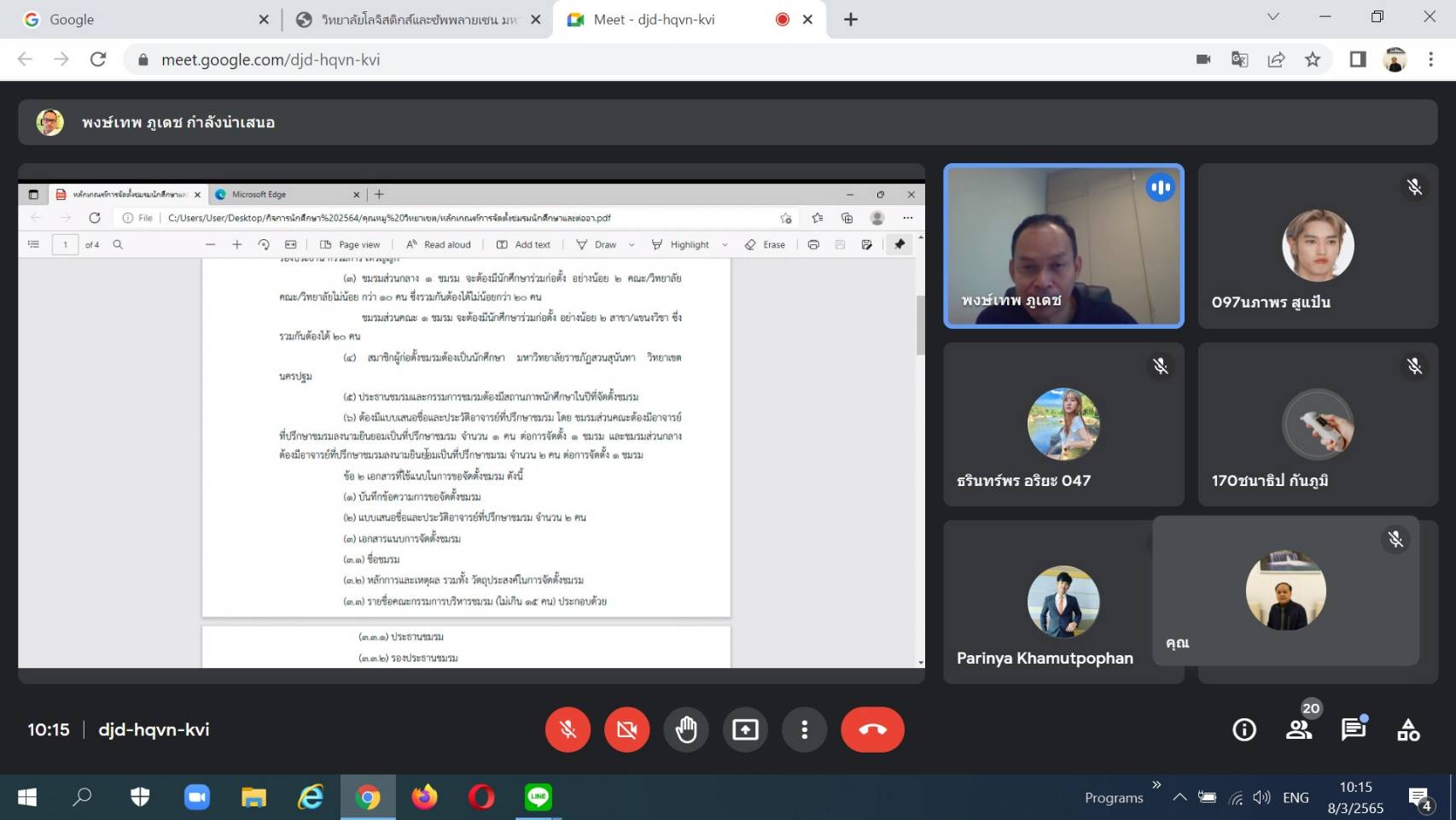 วันที่ 8 มีนาคม 2565 ดร.พงษ์เทพ ภูเดช รองคณบดีฝ่ายกิจการนักศึกษา เป็นประธานการประชุมชี้แจง หลักเกณฑ์การจัดตั้งชมรมนักศึกษา และการต่ออายุชมรมร่วมกับประธานชมรมและตัวแทนชมรมวิทยาลัยโลจิสติกส์และซัพพลายเชน ในรูปแบบออนไลน์ ผ่าน Google Meet