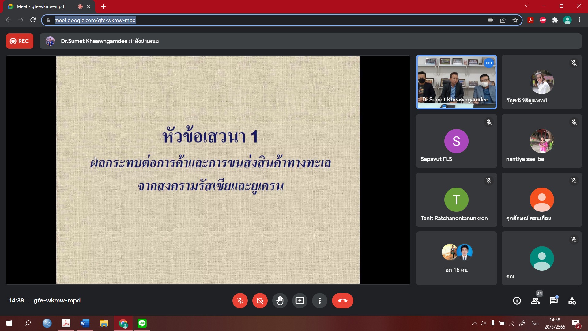 ภาพบรรยากาศการเสวนา ในวันที่ 20 มีนาคม 2565 โดย ดร.สุเมธ เขียวงามดี ผู้บริหารและผู้จัดการทั่วไป บริษัท เอสเอ็มเอ็ม (ประเทศไทย) จำกัด คุณวิเชียร รุ่งปัญญา กรรมการผู้จัดการ บริษัท ฟอลคอน โลจิสติคส์ โซลูชั่น จำกัด พร้อมด้วย คุณสรรพวุฒิ รุ่งปัญญา ผู้จัดการทั่วไป ในหัวข้อการเสวนา ดังนี้ 1) ผลกระทบต่อการค้าและการขนส่งสินค้าทางทะเลจากสงครามรัสเซียและยูเครน 2) รถไฟจีน - ลาว กับโอกาสทางธุรกิจของไทย ให้แก่นักศึกษาปริญญาเอก ในรายวิชา DBA8111 การสัมนาด้านการจัดการโลจิสติกส์และซัพพลายเชนภายใต้การเปลี่ยนแปลง ในรูปแบบออนไลน์ ผ่าน Google Meet