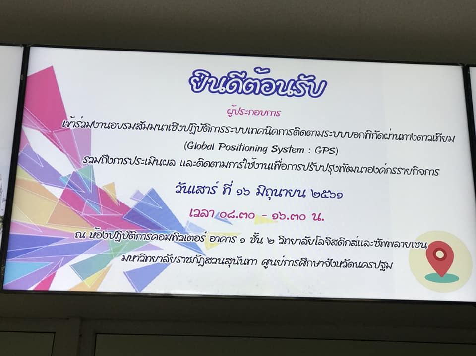 วันเสาร์ที่ 16 มิถุนายน 2561 ได้มีการจัดกิจกรรมอบรมสัมมนาเชิงปฏิบัติการระบบบอกพิกัดผ่านทางดาวเทียม(global Positioning System:GPS) รวมถึงการประเมินผลและติดตามการใช้งานเพื่อการปรับปรุงพัฒนาองค์กรรายกิจการ ปีงบประมาณ 2561 ให้กับผู้ประกอบการ ณ ห้องปฏิบัติการคอมพิวเตอร์ อาคาร1 ชั้น2 วิทยาลัยโลจิสติกส์และซัพพลายเชน มหาวิทยาลัยราชภัฏสวนสุนันทา ศูนย์การศึกษาจังหวัดนครปฐม โดยมีอาจารย์สุวัฒน์ นวลขาว รองคณบดีฝ่ายบริหาร วิทยาลัยโลจิสติกส์และซัพพลายเป็นผู้กล่าวเปิดงานกิจกรรมอบรมดังกล่าว