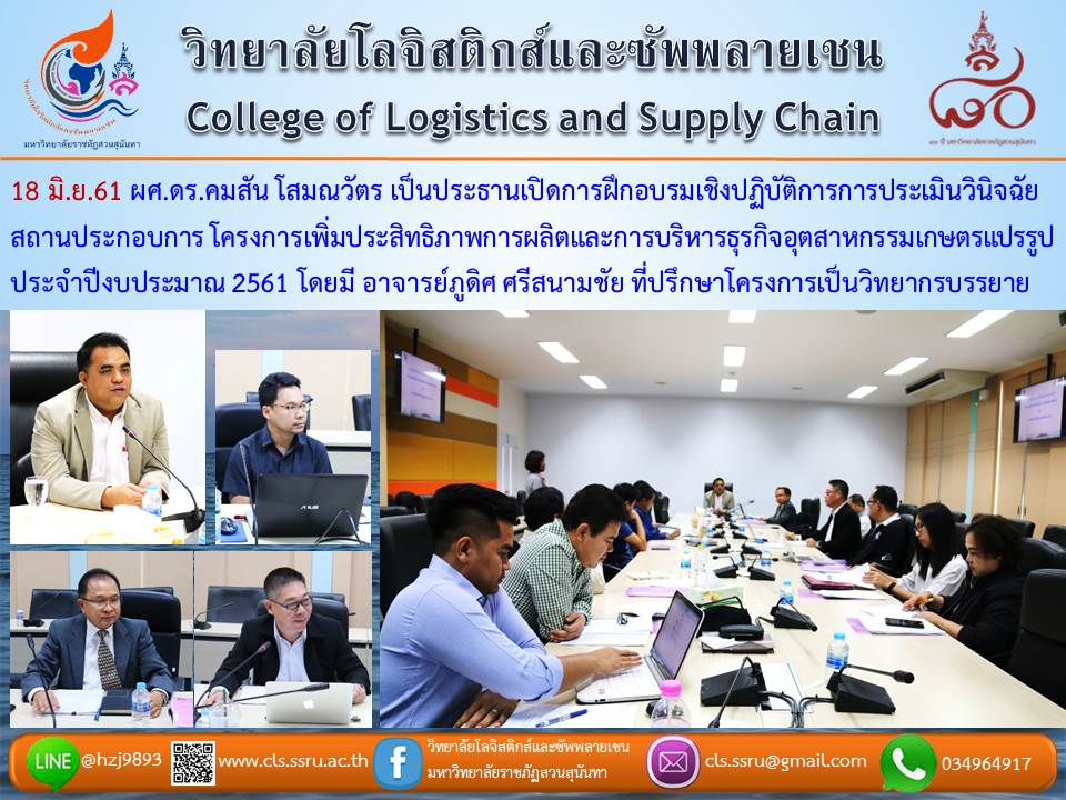 18 มิ.ย.61 ผศ.ดร.คมสัน โสมณวัตร เป็นประธานเปิดการฝึกอบรมเชิงปฏิบัติการการประเมินวินิจฉัยสถานประกอบการ โครงการเพิ่มประสิทธิภาพการผลิตและการบริหารธุรกิจอุตสาหกรรมเกษตรแปรรูป ประจำปีงบประมาณ 2561 โดยมี อาจารย์ภูดิศ ศรีสนามชัย ที่ปรึกษาโครงการเป็นวิทยากรบรรยา