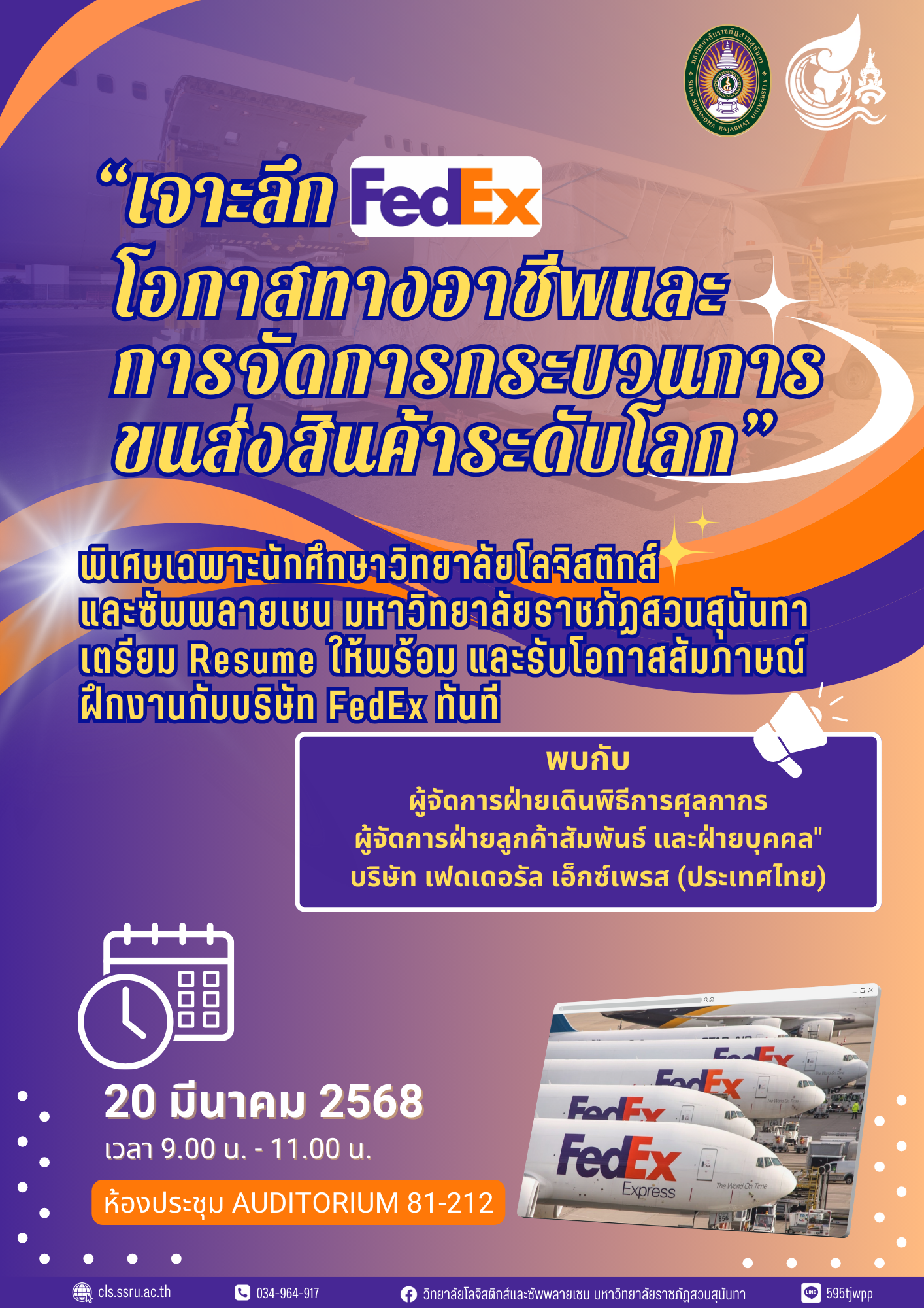 วิทยาลัยโลจิสติกส์และซัพพลายเชน มหาวิทยาลัยราชภัฏสวนสุนันทา ขอเชิญนักศึกษาเข้าร่วมฟังบรรยายพิเศษในหัวข้อ "เจาะลึก FedEx: โอกาสทางอาชีพและการจัดการกระบวนการขนส่งสินค้าระดับโลก"