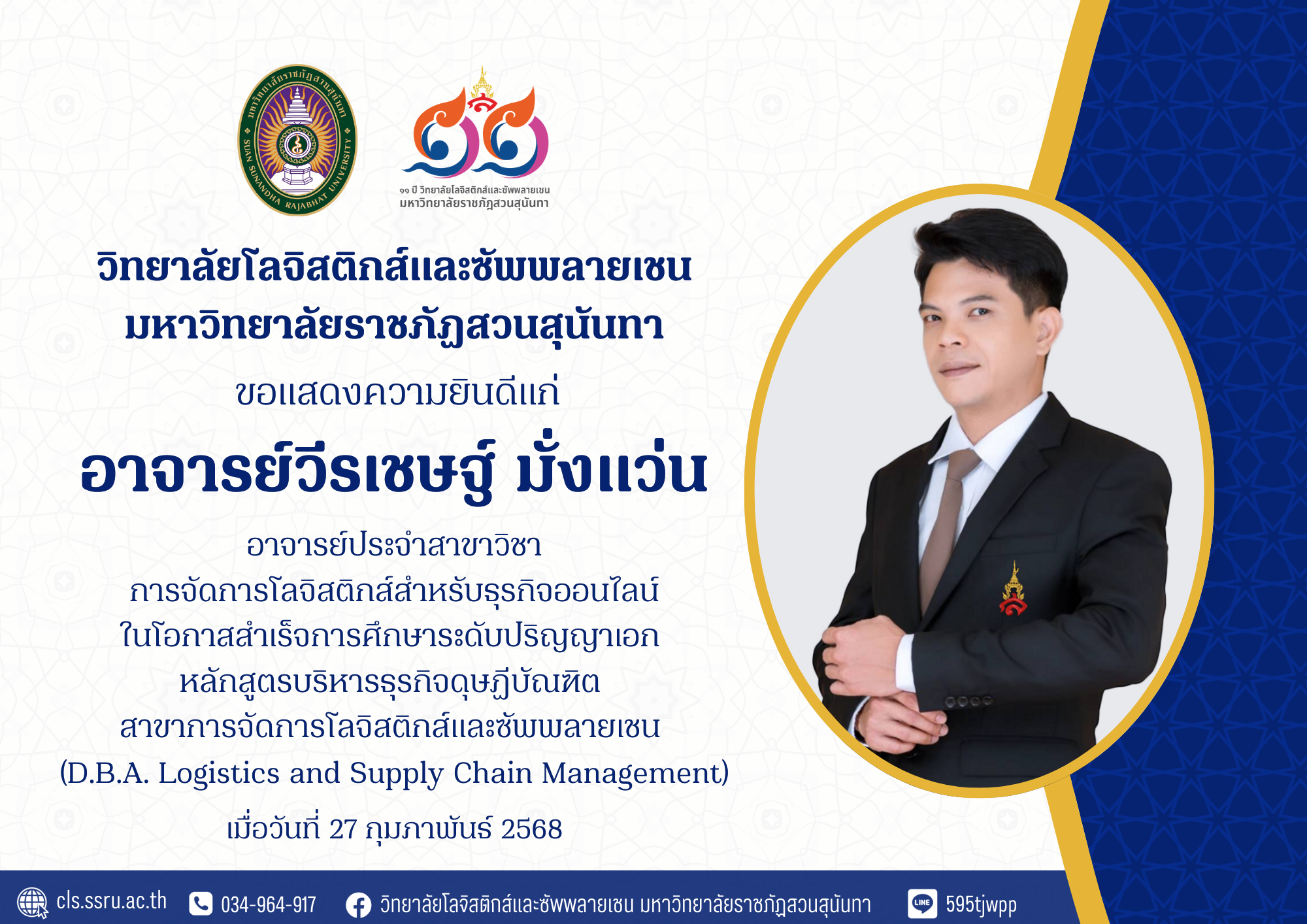 วิทยาลัยโลจิสติกส์และซัพพลายเชน มหาวิทยาลัยราชภัฏสวนสุนันทา ขอแสดงความยินดีกับ อาจารย์วีรเชษฐ์ มั่งแว่น อาจารย์ประจำสาขาวิชา การจัดการโลจิสติกส์สำหรับธุรกิจออนไลน์ ในโอกาสสำเร็จการศึกษาระดับปริญญาเอก หลักสูตรบริหารธุรกิจดุษฏีบัณฑิต สาขาการจัดการโลจิสติกส์และซัพพลายเชน (D.B.A. Logistics and Supply Chain Management) เมื่อวันที่ 27 กุมภาพันธ์ 2568