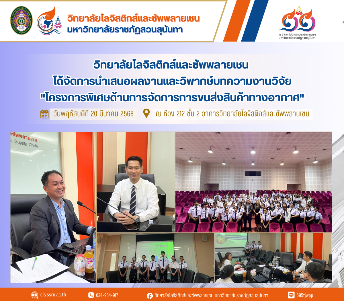 วิทยาลัยโลจิสติกส์และซัพพลายเชน ได้จัดการนำเสนอผลงานและวิพากษ์บทความงานวิจัย"โครงการพิเศษด้านการจัดการการขนส่งสินค้าทางอากาศ" โดยมี ผศ.ดร.ณัฏฐ์พงษ์ จันทชโลบล เป็นผู้ทรงคุณวุฒิและผู้เชี่ยวชาญด้านอุตสาหกรรมการบินและการขนส่งทางอากาศ เป็นประธานในโครงการ และมีคณะกรรมการในการวิพากษ์ ร่วมกับ ดร.สันติพงศ์ จิโรจน์กุล กิจ รองคณบดีฝ่ายบริหาร ดร.ปุญญา หีดจันทร์ ดร.สราวุธ พุฒนวล อาจารย์นิภาวรรณ ภูจอม และ อาจารย์ปาลิตา คำขวัญ เข้าร่วมเป็นกรรมการโครงการในครั้งนี้