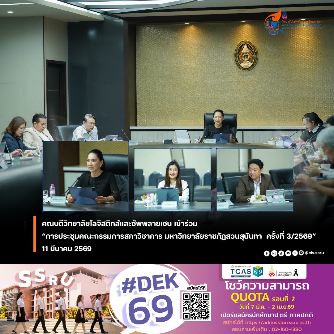 วิทยาลัยโลจิสติกส์และซัพพลายเชน นำโดย ผู้ช่วยศาสตราจารย์ ดร.ชณิชา หมอยาดี คณบดีวิทยาลัยฯ พร้อมด้วย คุณเกตติวิทย์ สิทธิสุนทรวงศ์ ผู้ทรงวุฒิ เข้าร่วมการประชุมคณะกรรมการสภาวิชาการ ครั้งที่ 3/2569 โดยมี รองศาสตราจารย์ ดร.ชุติกาญจน์ ศรีวิบูลย์ อธิการบดีมหาวิทยาลัยราชภัฏสวนสุนันทาเป็นประธานในการประชุม