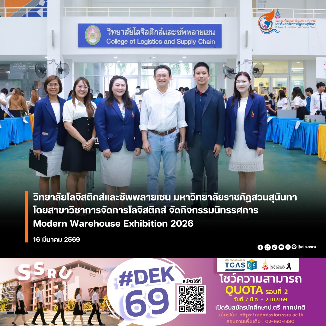 วิทยาลัยโลจิสติกส์และซัพพลายเชน มหาวิทยาลัยราชภัฏสวนสุนันทา โดยสาขาวิชาการจัดการโลจิสติกส์ จัดกิจกรรมนิทรรศการ Modern Warehouse Exhibition 2026 “นิทรรศการแสดงผลงานนักศึกษาเกี่ยวกับคลังสินค้าจำลอง 2026” ภายใต้รายวิชา LOG1208 การจัดการคลังสินค้าสมัยใหม่