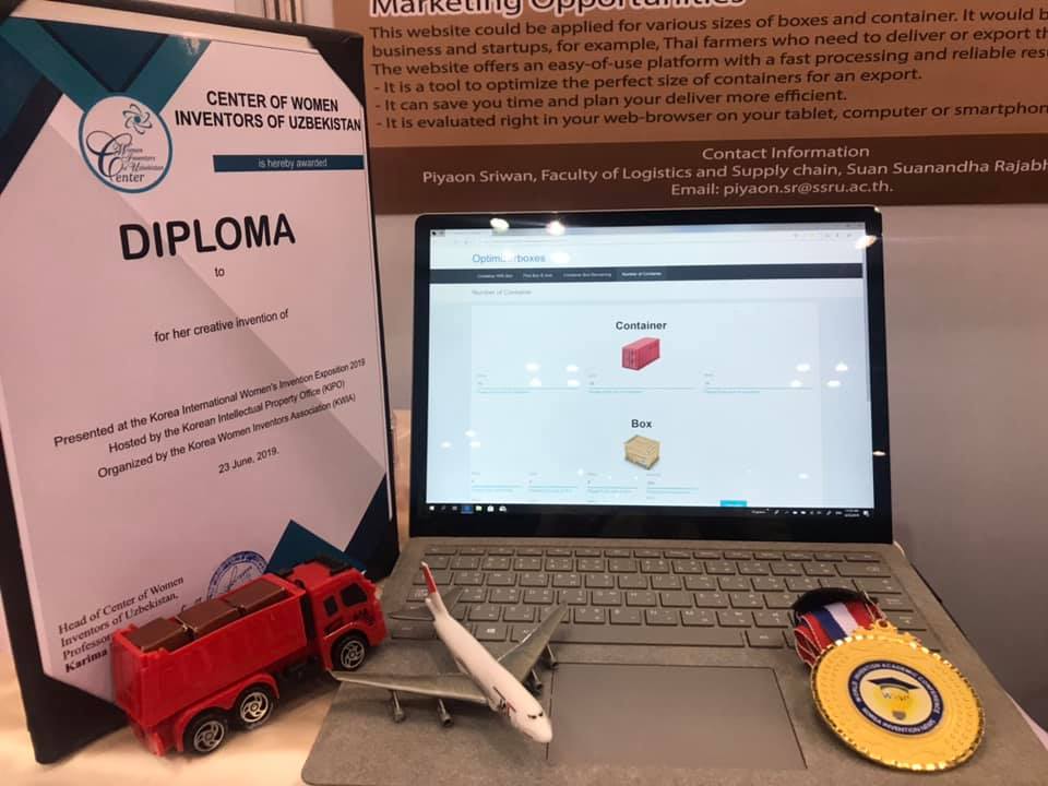 อาจารย์ปิยะอร ศรีวรรณ อาจารย์จากวิทยาลัยโลจิสติกส์และซัพพลายเชน ได้เดินทางกับสถาบันวิจัยและพัฒนา เพื่อเข้าร่วมประกวดผลงานวิจัยในงาน Korea International Women ‘s Invention Exposition (KIWIE2019) ณ KINTEX Mall กรุงโซล สาธารณรัฐเกาหลี เพื่อนำเสนอผลงานเรื่อง Optimizerboxes โดยได้รับรางวัล Special Award from Center of Women Inventors of Uzbekistan และรางวัล Special Award Medal from World Invention Academic Conference, Korea Invention News