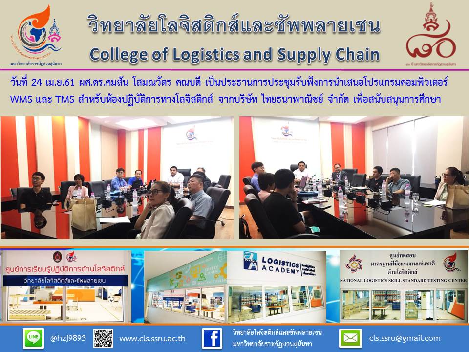 > วันที่ 24 เม.ษ. 61 ผศ.ดร.คมสัน โสมณวัตร คณบดี เป็นประธานการประชุมรับฟังการนำเสนอโปรแกรมคอมพิวเตอร์ WMS และ TMS สำหรับห้องปฏิบัติการทางโลจิสติกส์ จาก บ.ไทยธนาพาณิชย์ จำกัด
