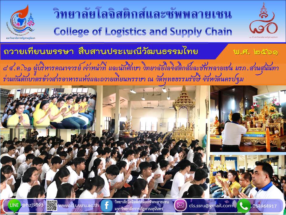 ๘ ส.ค.๖๑ ผู้บริหารคณาจารย์ เจ้าหน้าที่ และนักศึกษา วิทยาลัยโลจิสติกส์และซัพพลายเชน มรภ.สวนสุนันทา ร่วมกันตักบาตรข้าวสารอาหารแห้งและถวายเทียนพรรษา ณ วัดพุทธธรรมรังษี จังหวัดนครปฐม