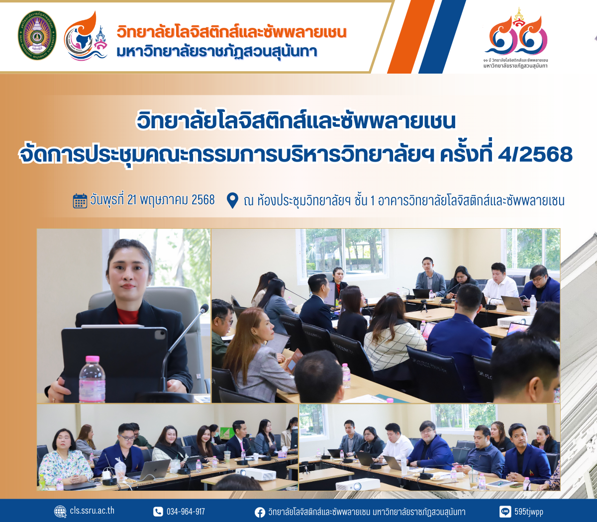 วิทยาลัยโลจิสติกส์และซัพพลายเชน จัดการประชุมคณะกรรมการบริหารวิทยาลัยฯ ครั้งที่ 4/2568 โดย ผู้ช่วยศาสตราจารย์ ดร.ชณิชา หมอยาดี คณบดีวิทยาลัยฯ เป็นประธารในการประชุม พร้อมด้วย คณะผู้บริหาร คณาจารย์ และเจ้าหน้าที่เกี่ยวข้อง ร่วมการประชุม