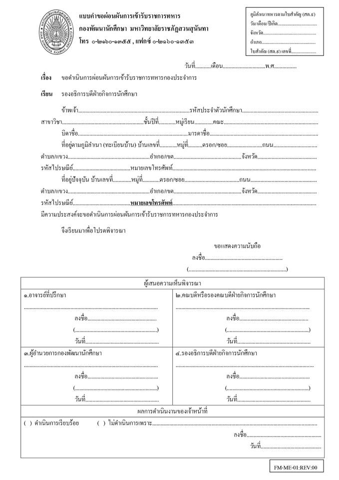 นักศึกษาชาย ที่มีความประสงค์จะทำการผ่อนผันการตรวจเลือกเพื่อเข้ารับราชการทหารกองประจำการ ประจำปีการศึกษา ๒๕๖๑ (ผ่อนผันการเกณฑ์ทหาร)
