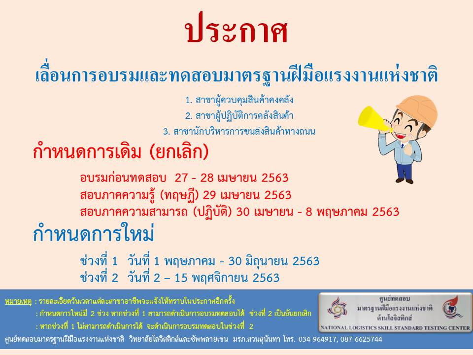 ประกาศเลื่อนการอบรมและทดสอบมาตรฐานฝีมือแรงงานแห่งชาติ